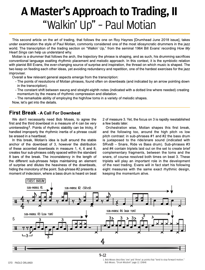 A second published feature focused on Paul Motianâs trading in âWalking Upâ from Bill Evansâ How My Heart Sings. This article brings Motianâs lyrical, conversational drumming to the page, helping you understand his abstract style and how to apply that sense of flow to your own playing.